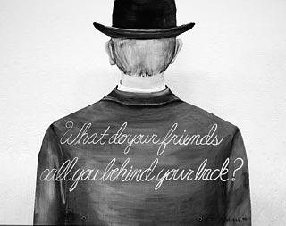 I was working on a book when I came across Francis Picabias quote, My arse contemplates those who talk behind my back. A few minutes later I was looking through the photos in my camera and saw a photograph of a painting at the Musee Mechanique. The painting was clearly an amateurishbut competentimitation of René Magritte. The art was attached to the wall with screws through the image, so at least it wasnt pretentious. The painting featured the words on a mans back, What do your friends call you behind your back? Picabia and Magritte were roughly the same age. I wonder if they met before today? I like happy coincidences.