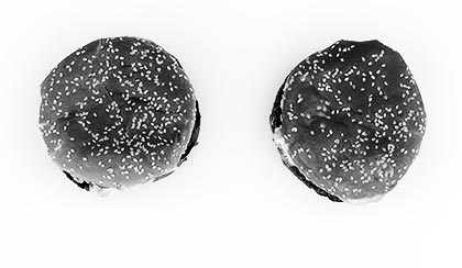 Thia sponsored this year’s piece using hamburgers. Yesterday, she brought me a couple of Whoppers, the brand name of the sandwiches sold by the Burger King “restaurant” chain. I put them between two sheets of art board, then put the assemblage in a large plastic bag in the path of the steamroller.
