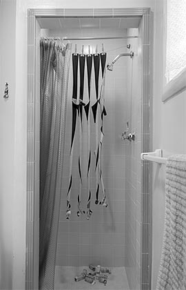 It all started when Dr. Landweber exhumed five rolls of 120 film from the bowels of his freezer. I recreated one of my night terrors by hanging the rolls of undeveloped film, still attached to the paper backing, from the clothesline in the shower where the freshly developed film used to dry. Now that I’ve seen and photographed that horrorifical vision, I wonder if I’ll revisit it in a bad dream? I suppose it doesn’t matter; I wouldn’t be surprised if there’s a long list of other worst-case anxiety scenarios on tap in my subconscious.