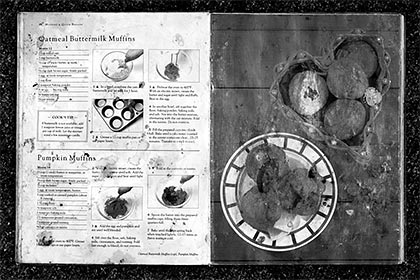 The crusty pages are stained with oil and a patina of flour from many previous breakfasts. It was so photographically photogenical that I had no choice but to take the visual bait.